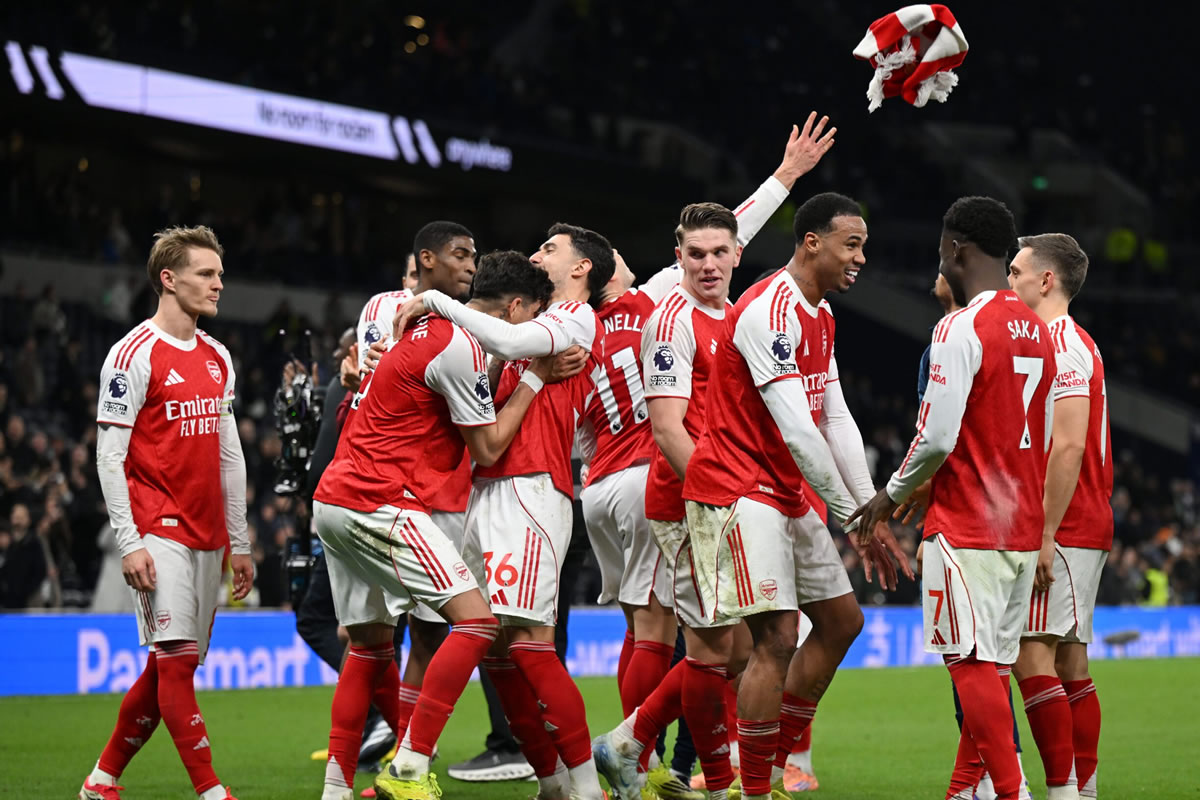 Arsenal emphatically beat Tottenham Hotspur 4-1 in the north London derby, with Eberechi Eze and Viktor Gyökeres each scoring twice, restoring their five-point Premier League lead with 10 matches remaining.