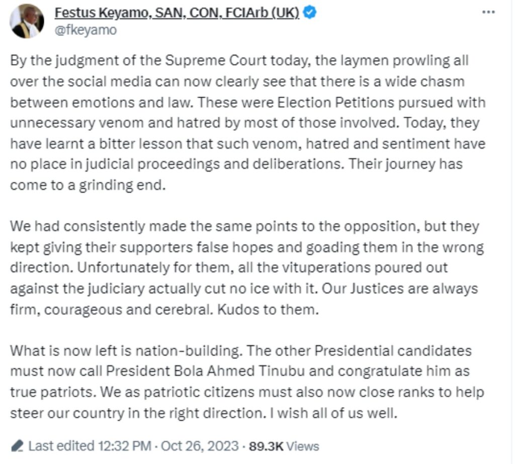 He made this statement in response to the Supreme Court’s decision today to reject the appeals brought by PDP candidates Atiku Abubakar and Peter Obi challenging Bola Tinubu’s declaration as the victor of the 2023 presidential contest.