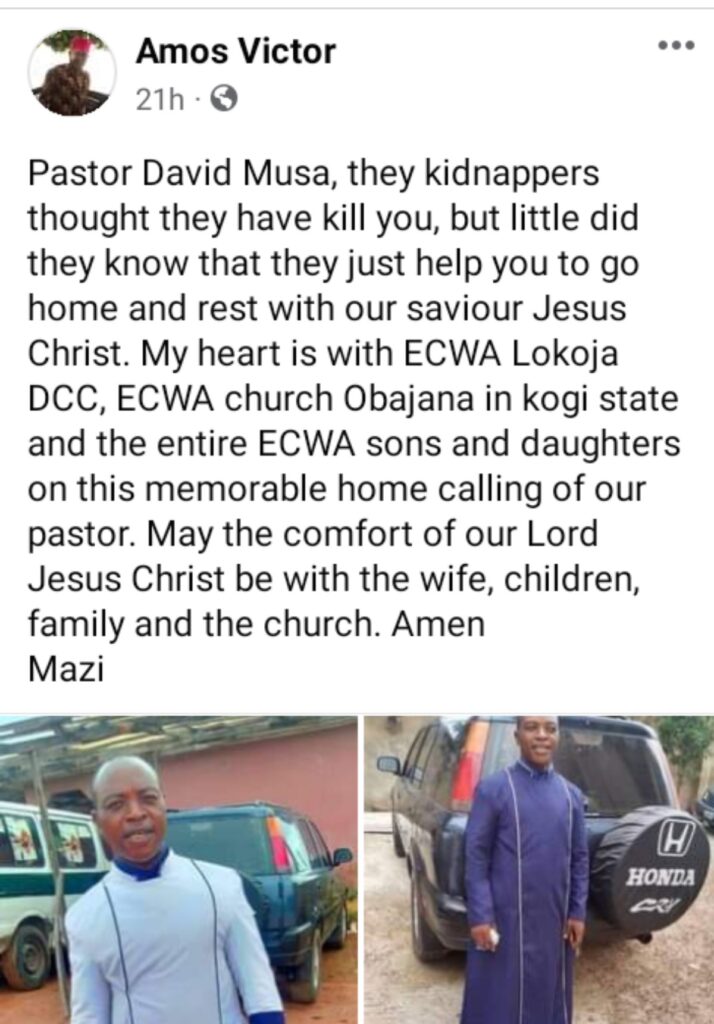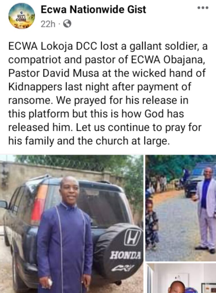 Following the payment of a N1,000,000 ransom in Kogi State, the kidnappers of David Musa, a pastor with the Evangelical Church Winning All (ECWA), assassinated him.