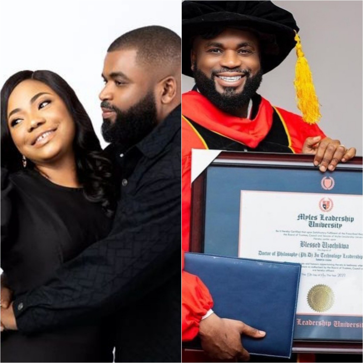 Nigerian gospel singer Mercy Chinwo is overjoyed to celebrate her husband Reverend Blessed recent honorary doctorate from Myles Leadership University.