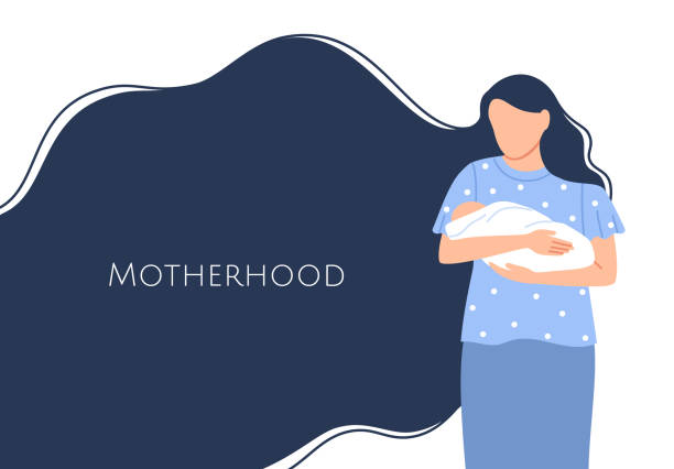 Mother with her newborn baby background design with blank text space. Adorable happy flat family mom with long hair and child together. Banner, invitation greeting card decoration vector illustration.