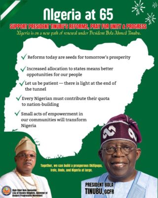 As Nigeria proudly marks its 65th Independence Anniversary, His Royal Highness, High Chief Dele Omosehin, the Lisa of Osooro Kingdom and convener of the Asejere Progressive Movement, is rallying the nation behind President Bola Ahmed Tinubu’s ambitious reform agenda. His heartfelt message emphasizes the need for prayers, patience, and unwavering patriotism as the country navigates these transformative changes.