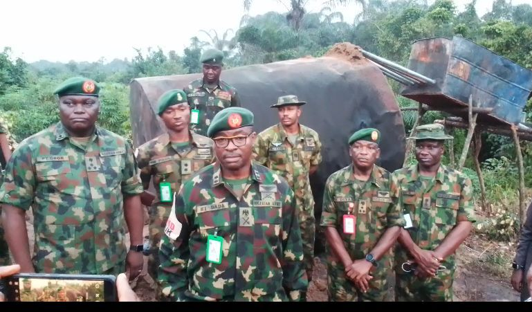 Speaking at the illegal refinery site with over 15 illegal refineries, the General Officer Commanding 82 Division, Major General Hassan Dada, who was accompanied by the Commander, 14 Brigade, Nigerian Army, Ohafia, Brigadier General Olusola Diya, as well as top military brass within the Division said, “We are here in furtherance of the operation that the media was invited about few days ago about illegal oil bunkering that is taking place here in Obeaku which is degrading the environment.
