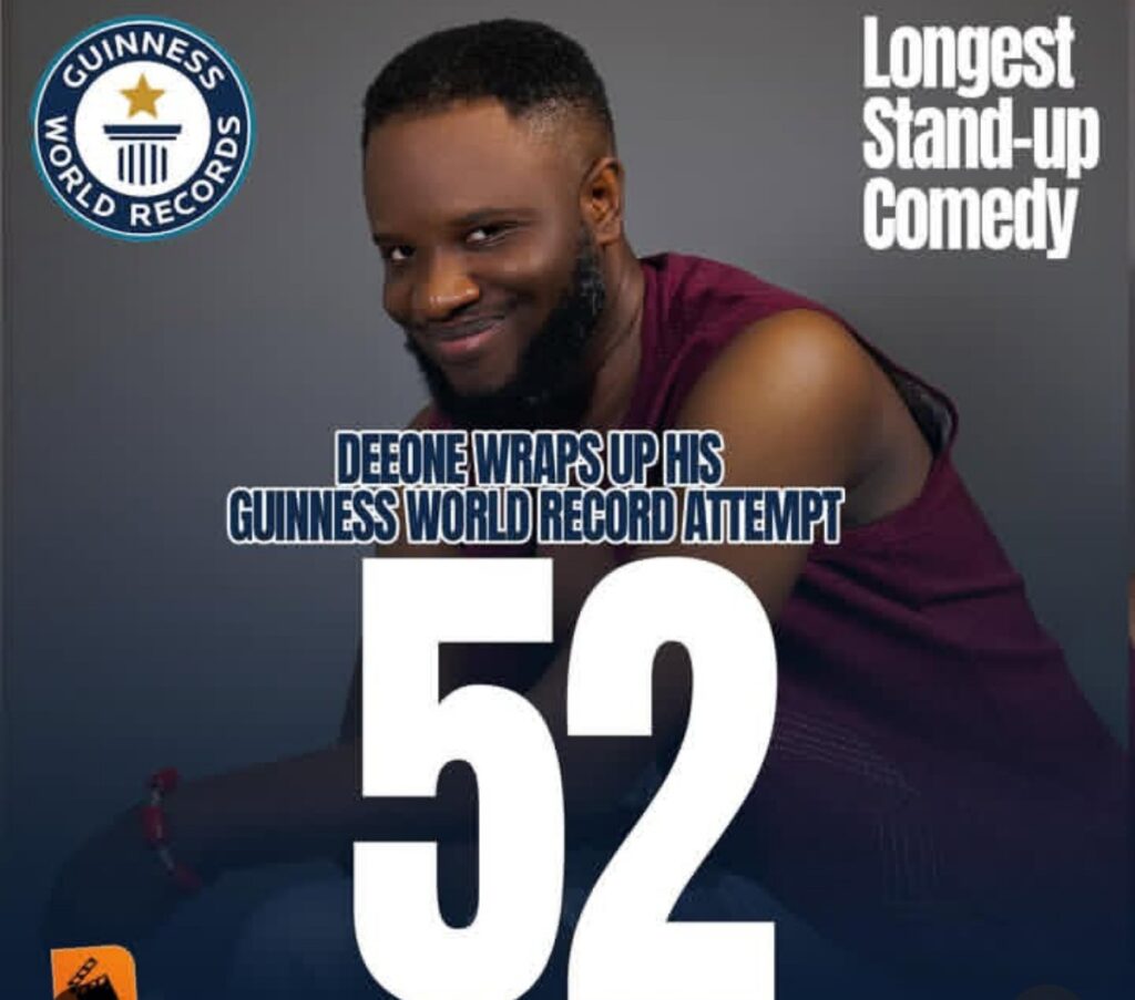 Kudos to DeeOne for attempting such an impressive Guinness World Record with a 52-hour stand-up comedy marathon. It’s a remarkable feat of endurance and talent. Also, shout-out to Nigerian comedian Seyi Law for recognizing and praising DeeOne’s efforts—celebrating comedy and dedication!