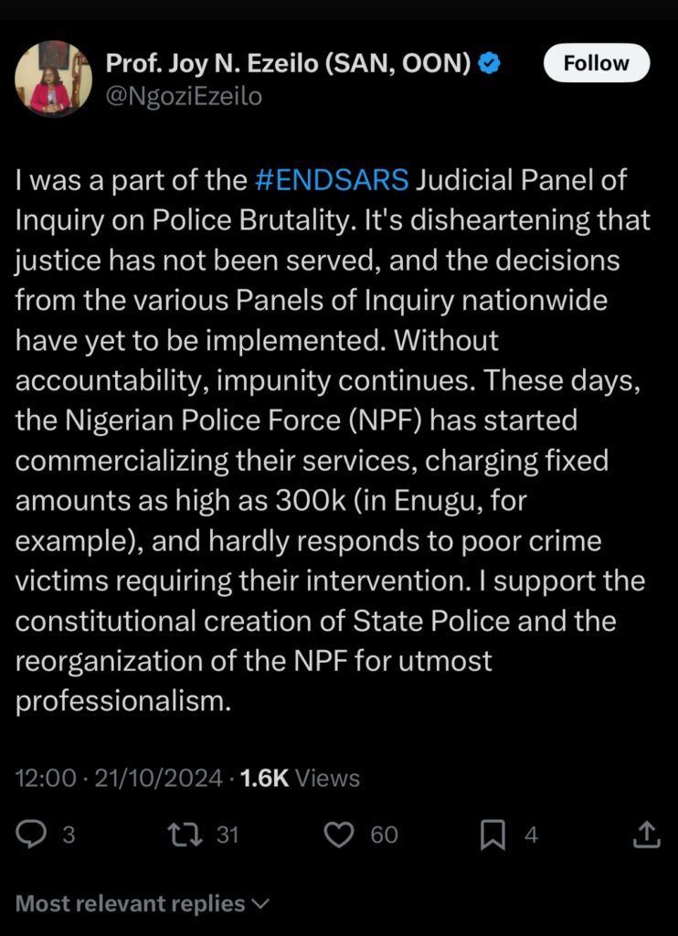 In a post on Monday, October 1, Ezeilo revealed that the Police charge set amounts of up to N300,000.