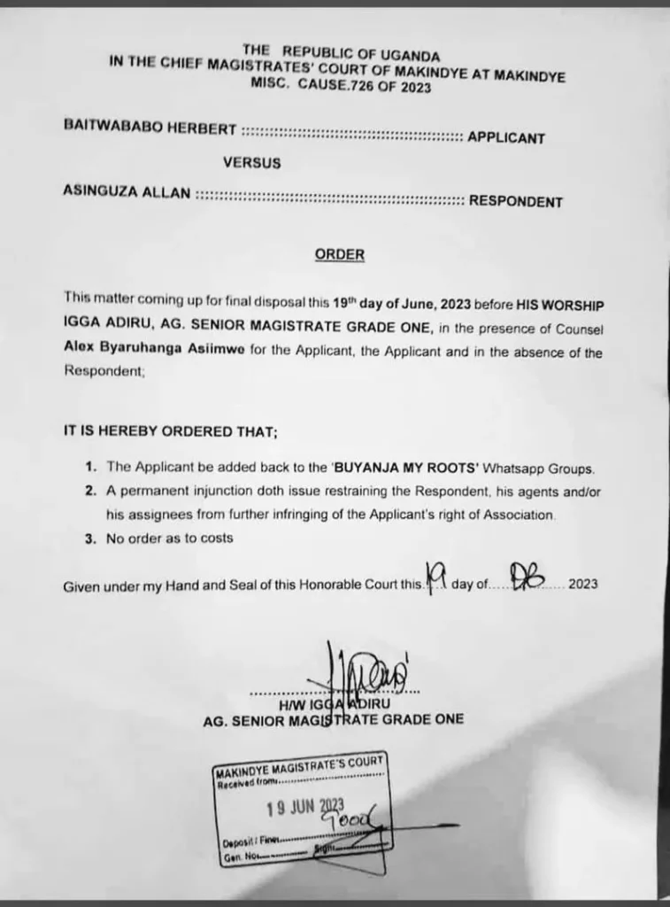 The order came as a result of an application filed by Herbert Baitwababo, who had gone to court to contest Allan Asinguza’s decision to ban him from the WhatsApp group “Buyanja My Roots.”